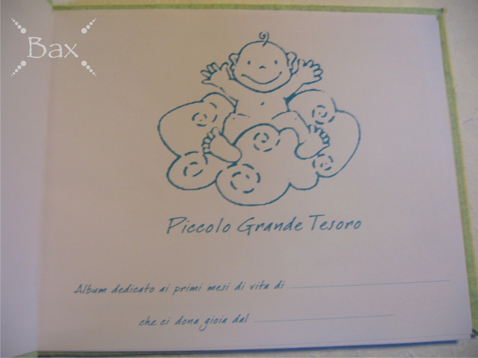 C'è l'album nascita in versione maschietto! E' sempre album nascita/guestbook per Battesimo, ma la copertina non ha applicazioni, ha un disegno fatto a mano da me coi colori a rilievo.